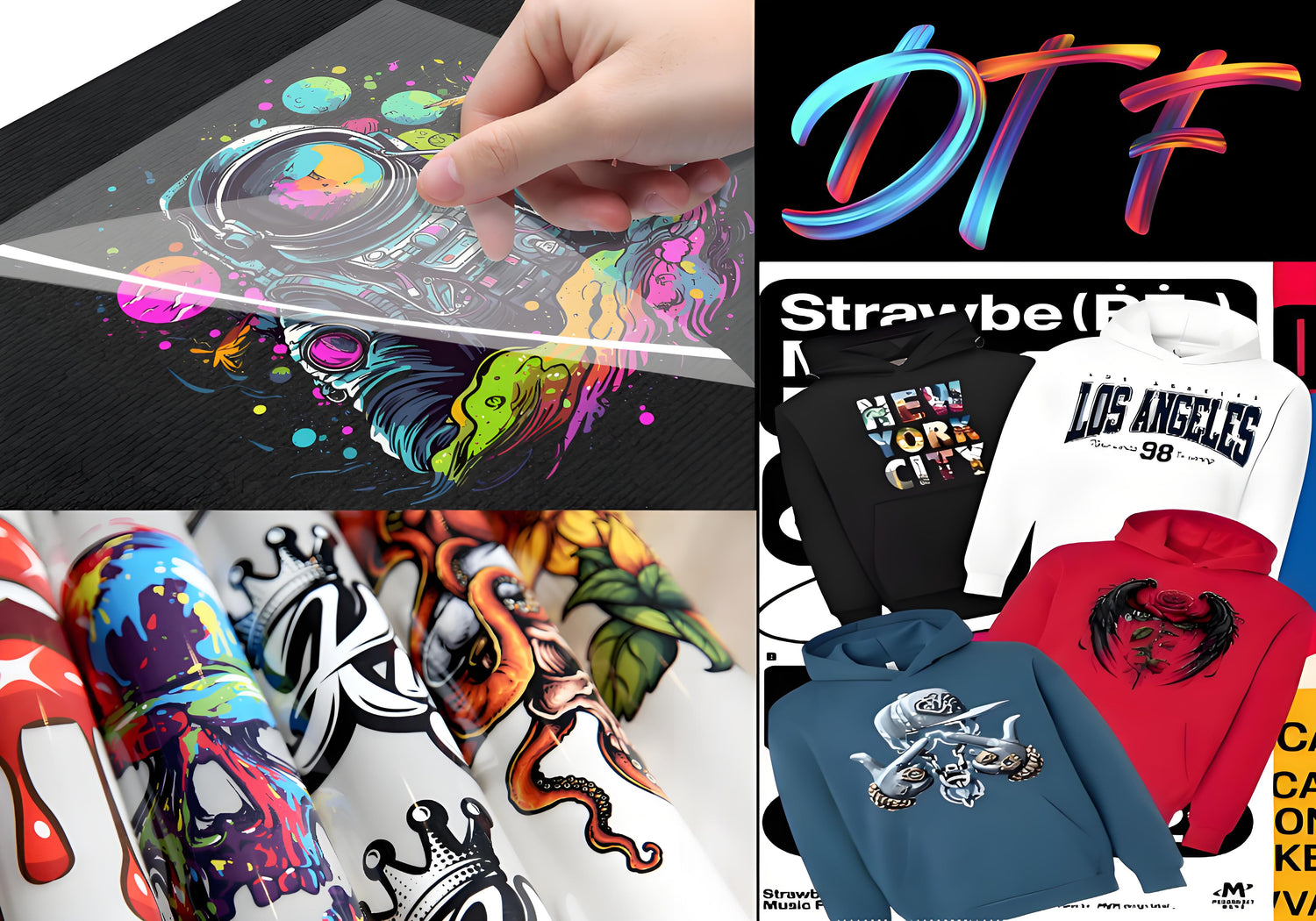 DTF printer is a revolutionary technology. Simply put, full color images are printed onto DTF film and then transferred to any color light or dark textile/garment such as cotton, silk, polyester, denim, canvas, etc.