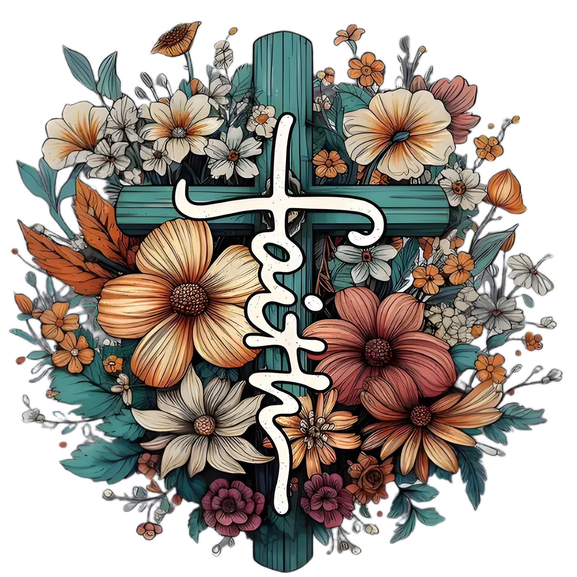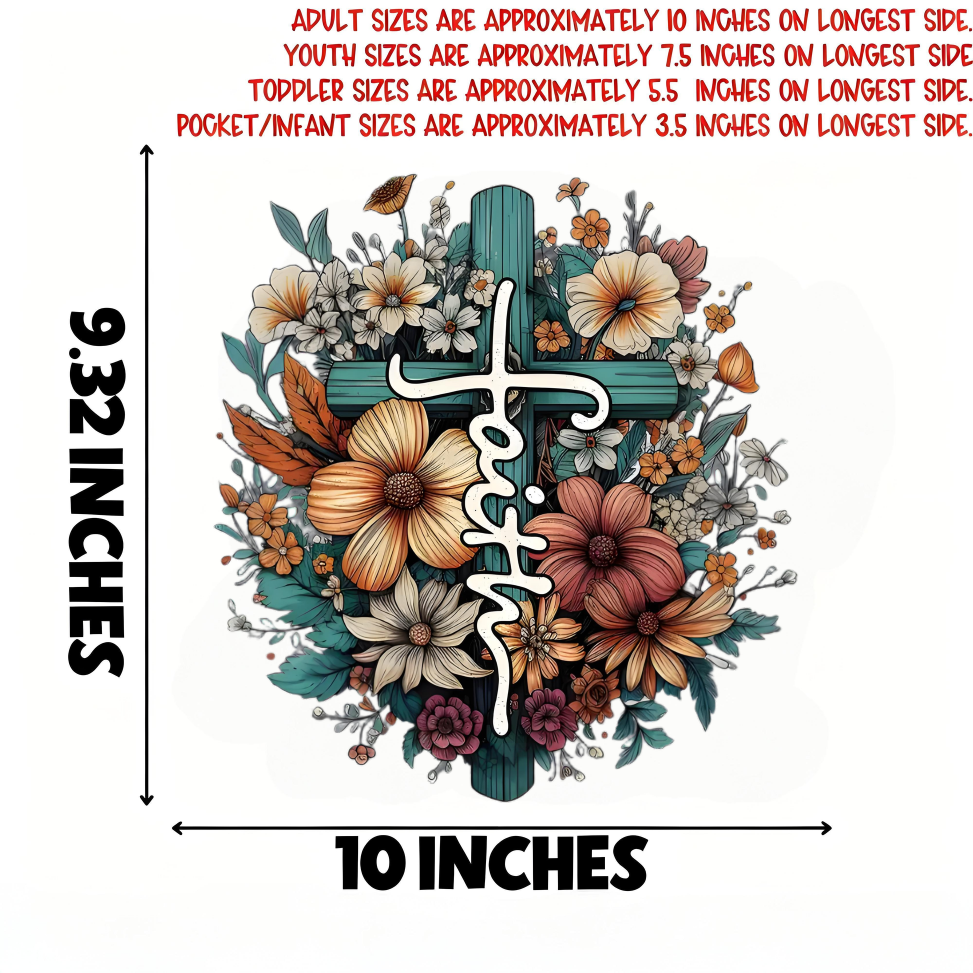 Colorful floral cross and "Faith" lettering iron-on transfer