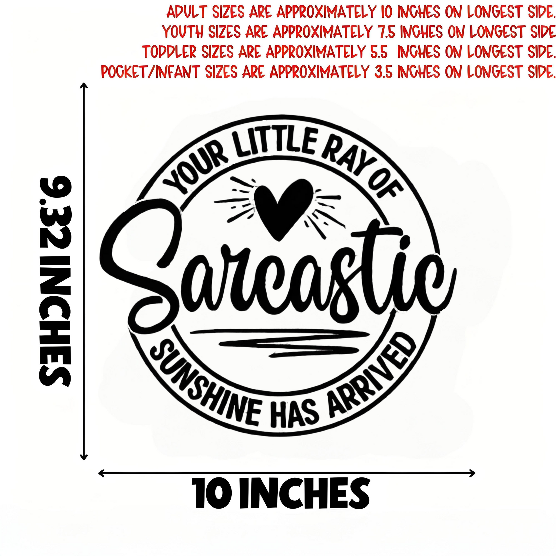 Sizes: Adult 10” longest side, Youth 7.5”, Toddler 5.5”, Pocket/Infant 3.5”. Transfer only—shirt not included.