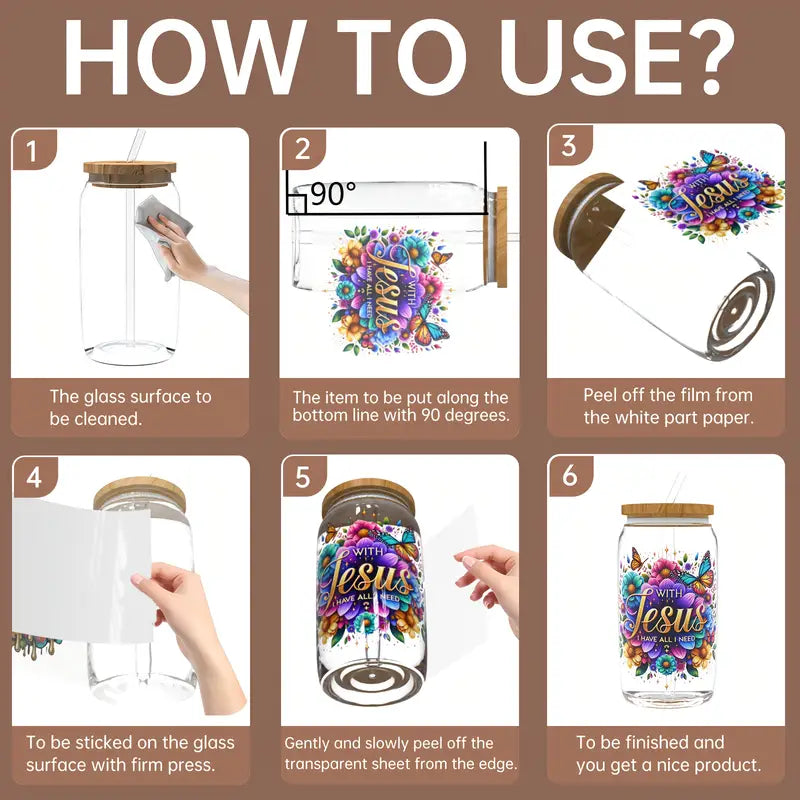 Waterslide Transfers: Applies with water, no heat needed. Laser printed - no need to seal before applying. Once applied, sealer may be added (optional). Permanent once completely dry - hand wash only. Don't allow item to soak in water after complete. Clear/transparent backing - for non-porous surfaces such as glass, candles, tumblers, wood, plastic, etc. Some examples of use: Glass cans, metal tumblers, wood furniture, toys, tumblers, cell phone cases, guitars, helmets, decorative ceramic wear, etc. White shown in an image will be transparent - printers cannot print white.
