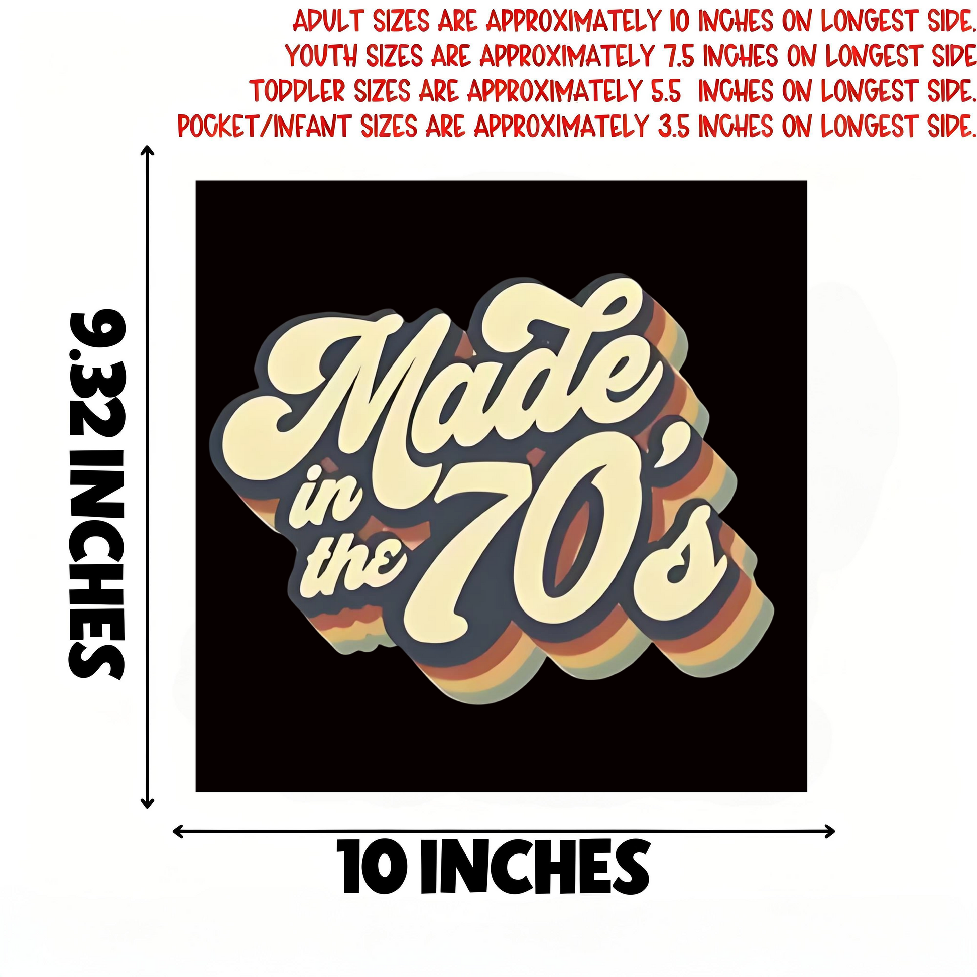 Sizes: Adult 10” longest side, Youth 7.5”, Toddler 5.5”, Pocket/Infant 3.5”. Transfer only—shirt not included.