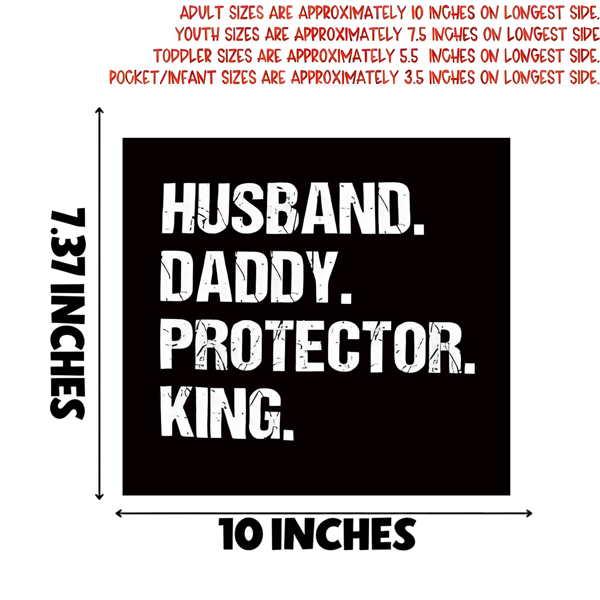 Sizes: Adult 10” longest side, Youth 7.5”, Toddler 5.5”, Pocket/Infant 3.5”. Transfer only—shirt not included.