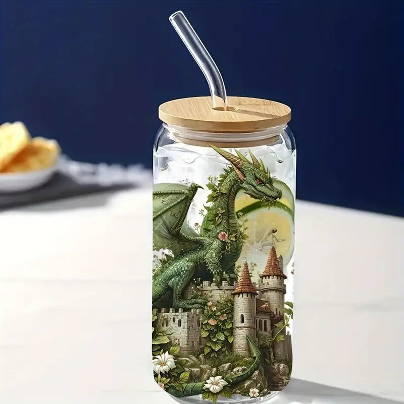 Pink dragon design 16 oz glass packable sticker beautiful flower coffee mug UV DTF